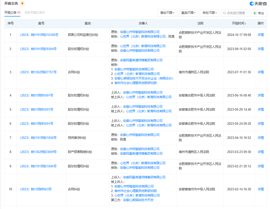 安徽心齐特智能科技有限公司触及多条开庭公告信息,案由为危害公司利益职责胶葛、股东知情权胶葛、民间假贷胶葛、产业危害赔偿胶葛等。