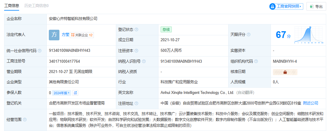 天眼查信息数据显现,安徽心齐特智能科技有限公司,成立于2021年,坐落安徽省合肥市,是一家以从事科技推广和使用服务业为主的企业。企业注册资本500万人民币。