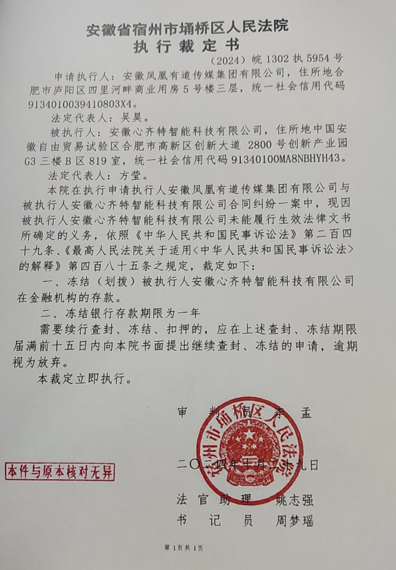 据安徽省宿州市埇桥区人民法院实行裁定书(2024)皖1302执5954号显现,在实行请求实行人安徽凤凰有道传媒集团有限公司与被实行人安徽心齐特智能科技有限公司合同胶葛一案中,因被实行人安徽心齐特智能科技有限公司未能实行收效法律文书所承认的职责,依照《中华人民共和国民事诉讼法》第二百四十九条、《最高人民法院关于适用中华人民共和国民事诉讼法)的解说》第四百八十五条之规则,冻住(划拨)被实行人安徽心齐特智能科技有限公司在金融机构的存款,冻住银行存款期限为一年。截止至发稿,被实行人安徽心齐特智能科技有限公司仍未实行收效法律文书所承认的职责。